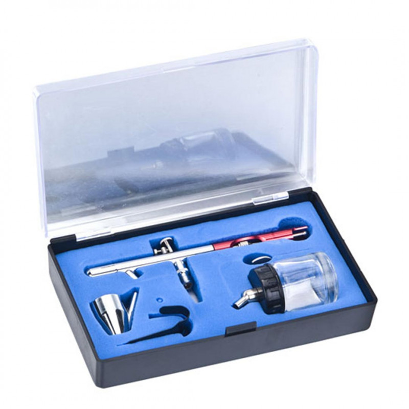 Coffret Aérographe double action anodisé rouge avec molette de réglage arrière.