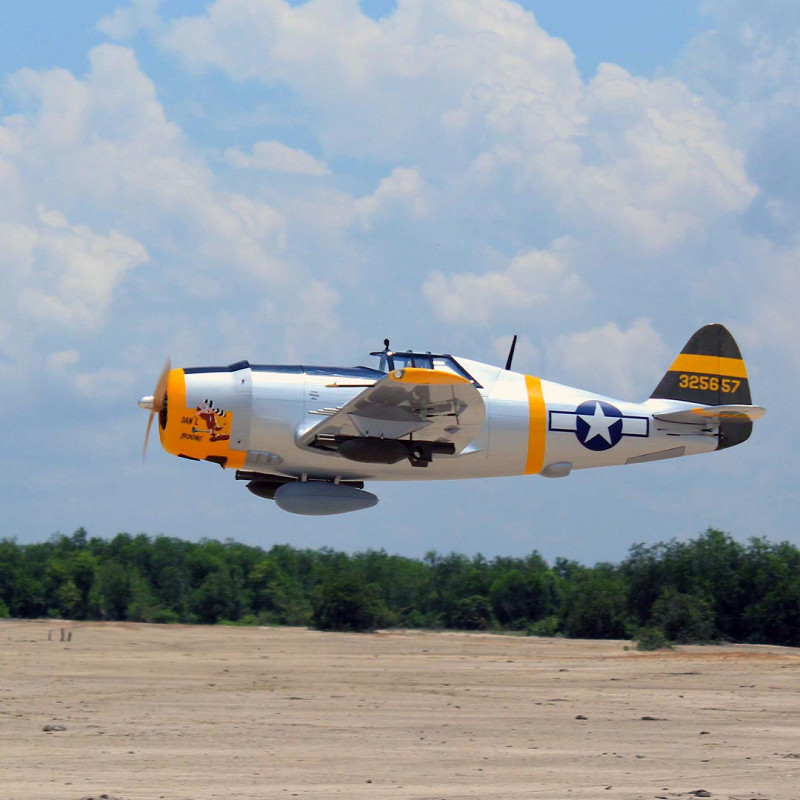 • Cette version Razorback du P-47 est aussi réaliste au sol qu'en plein vol avec son look de warbird très imposant.