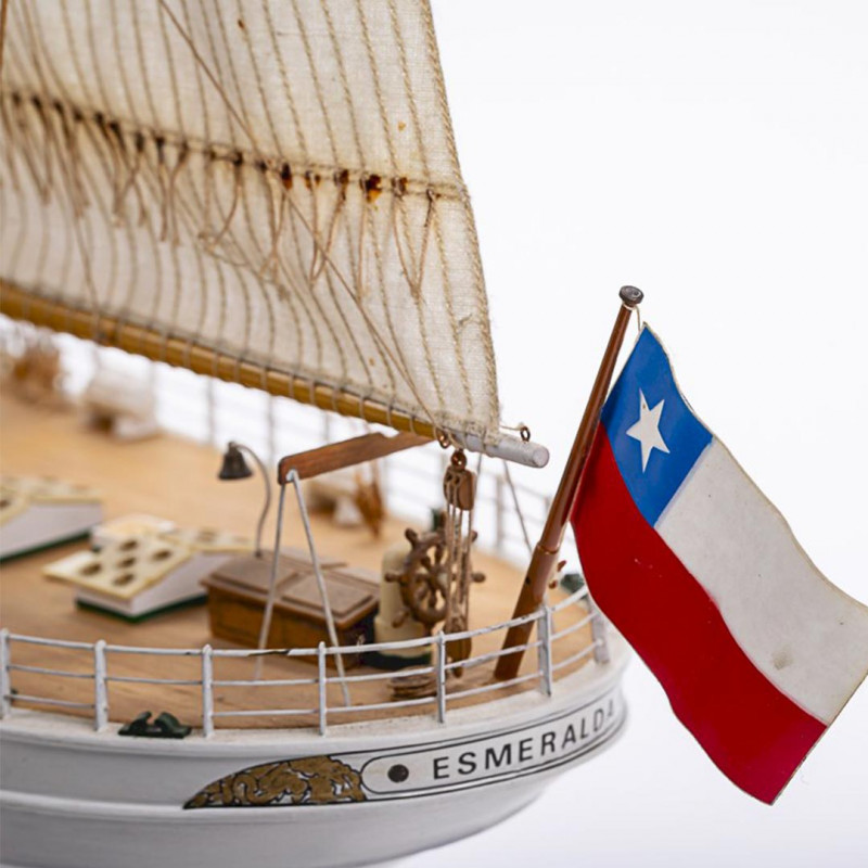 L’Esmeralda est bien plus qu’une maquette : c’est une œuvre d’art miniature, une véritable reproduction du quatrième plus grand voilier du monde, toujours en service dans la marine chilienne.
