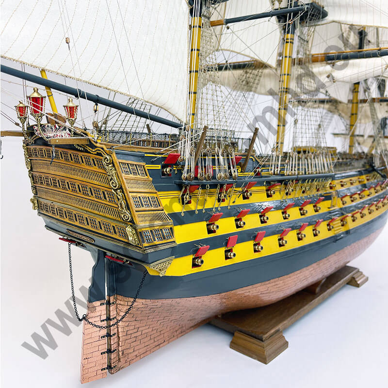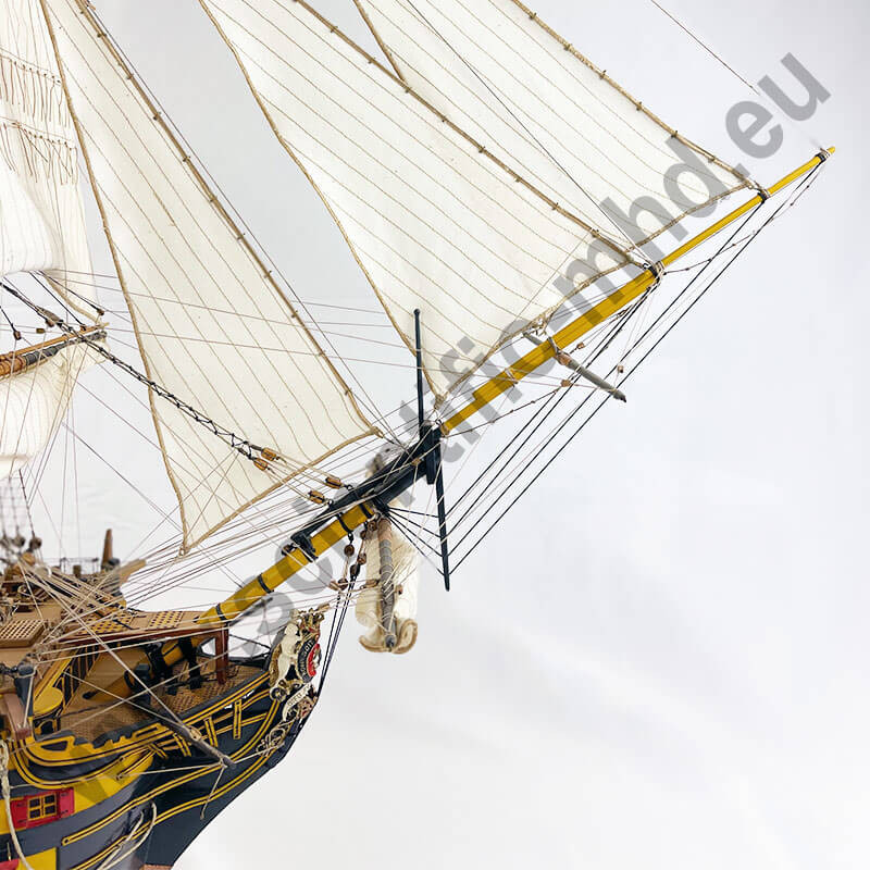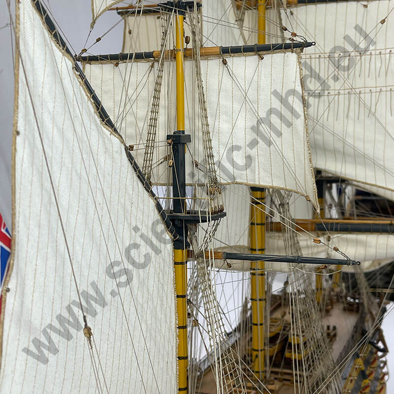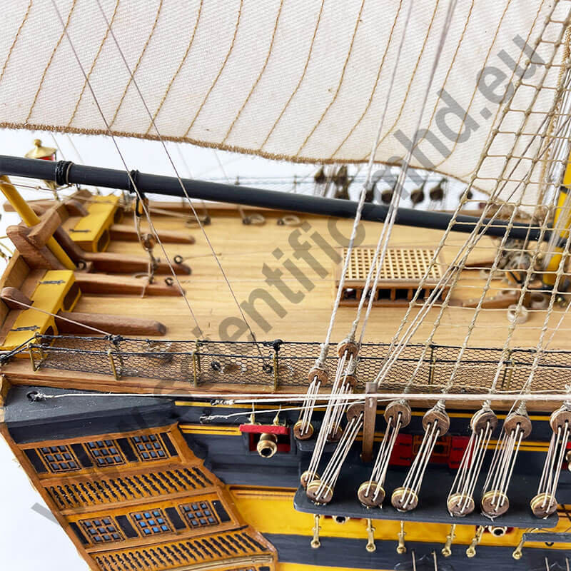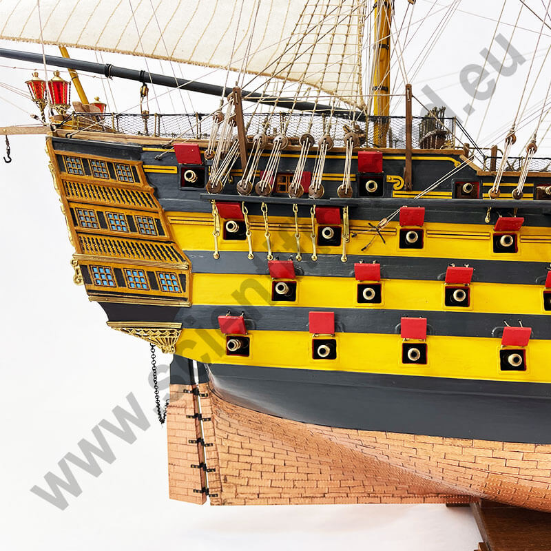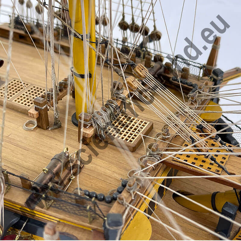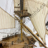 Les drapeaux sont imprimés sur de la soie véritable. Accastillage en laiton très détaillé, avec canons, lanternes, figure de proue , etc.