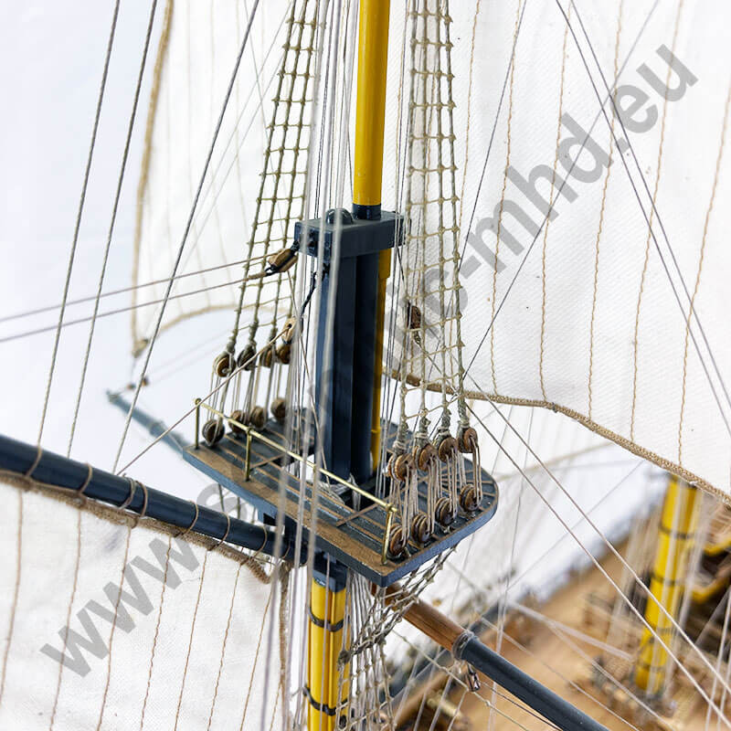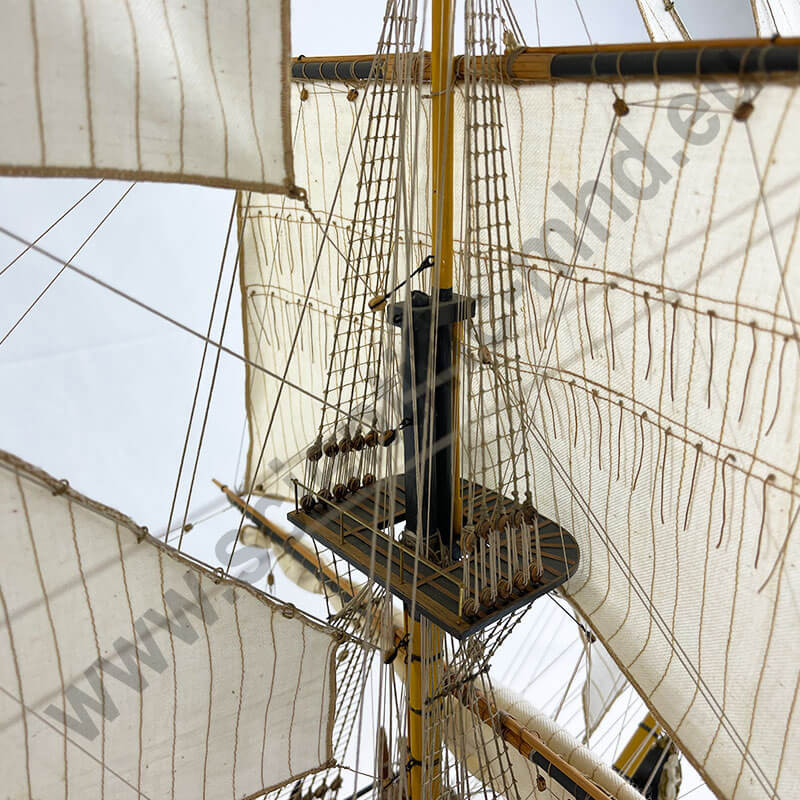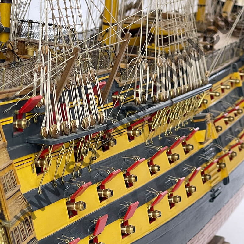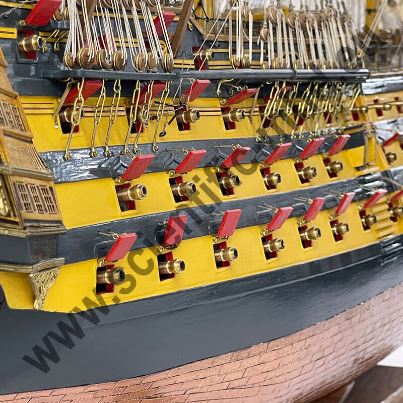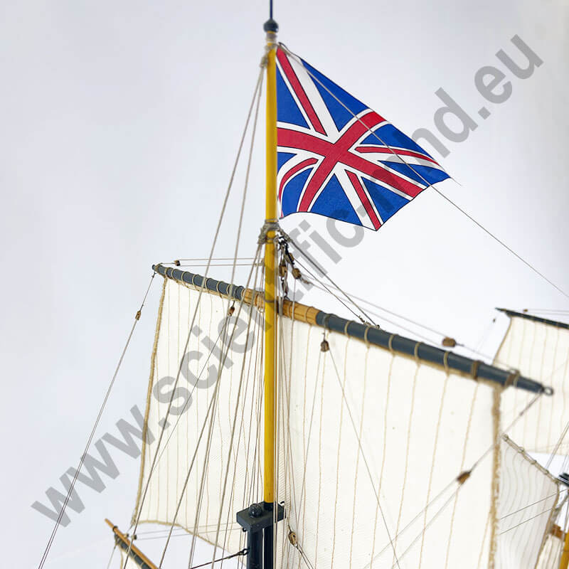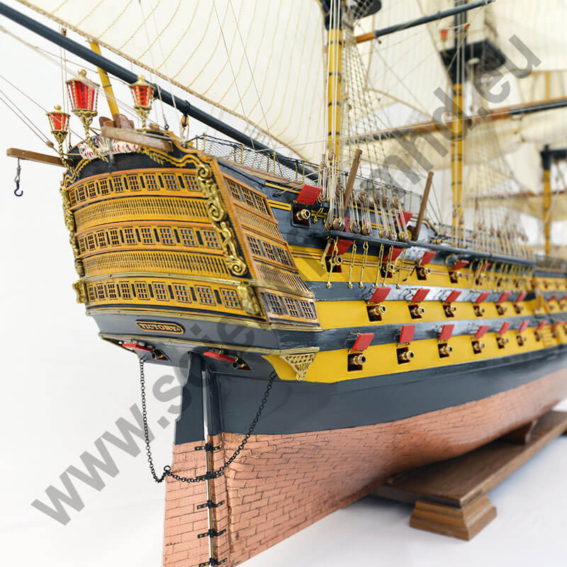 Les drapeaux sont imprimés sur de la soie véritable. Accastillage en laiton très détaillé, avec canons, lanternes, figure de proue , etc.