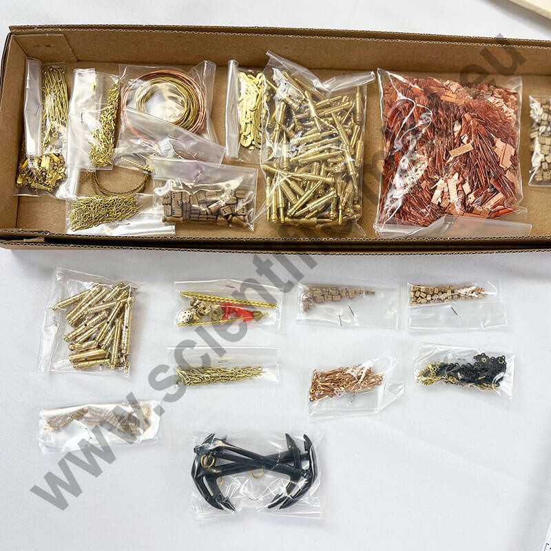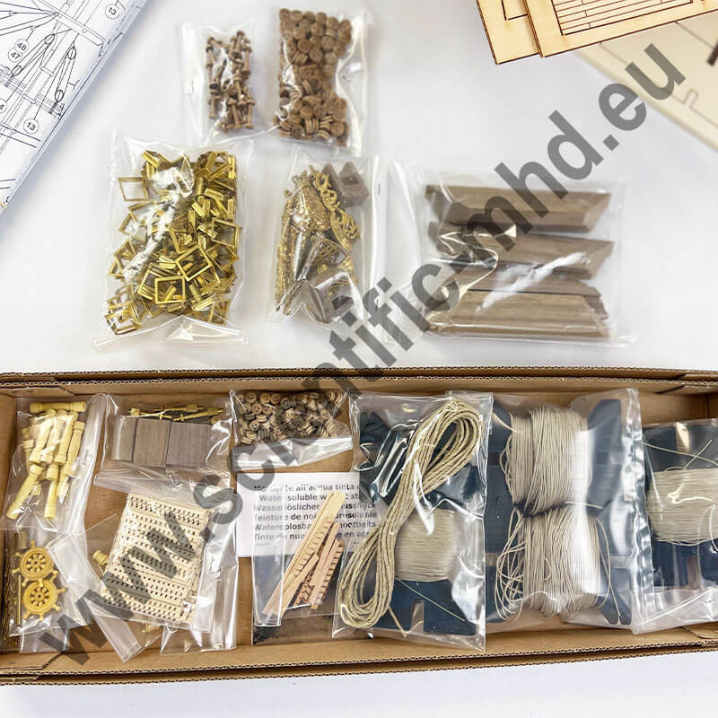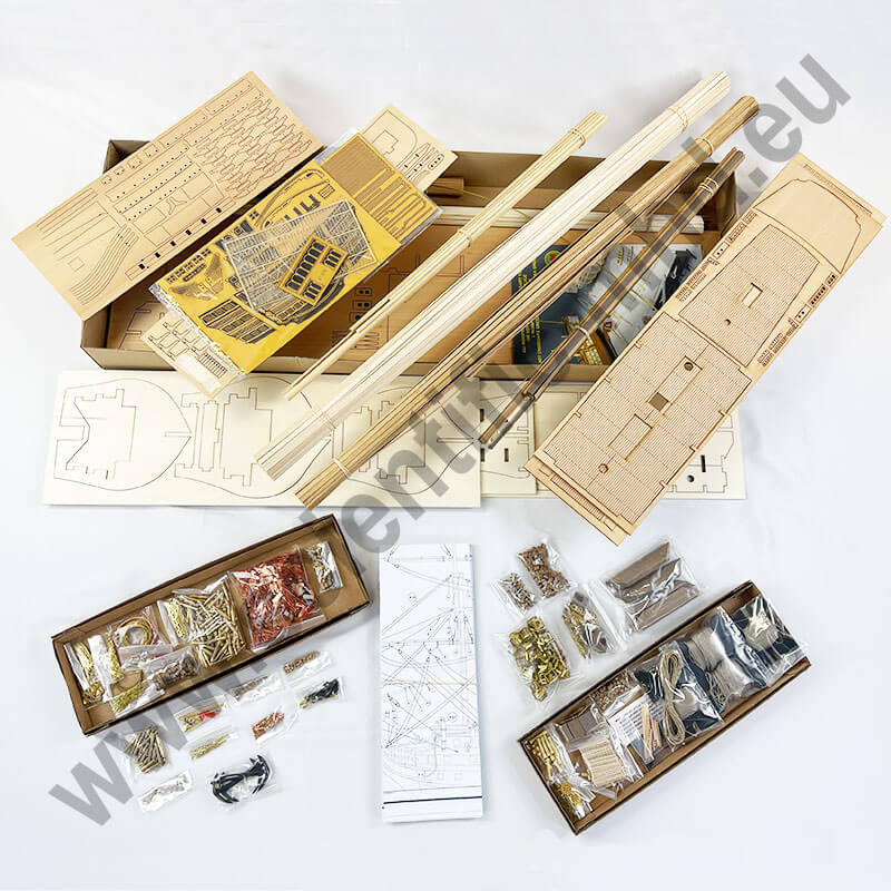 La boîte contient toutes les pièces en bois découpées au laser pour un montage et un ajustage parfait des pièces, la construction s'effectue par couples et double bordé.
