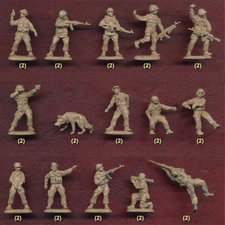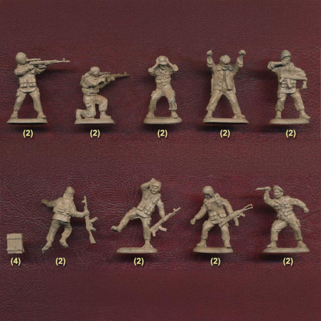 Les boîtes contiennent généralement plusieurs dizaines de figurines avec différentes poses (combat, marche, tir, commandement), ce qui favorise la création de scènes réalistes.