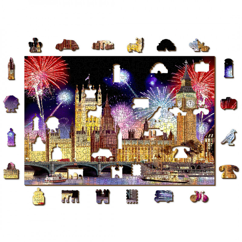 En assemblant ce puzzle pour enfants et adultes, revivez la beauté nocturne de Londres : le majestueux palais de Westminster, la silhouette intemporelle de Big Ben, le célèbre bus rouge traversant un pont éclairé, les feux d’artifice colorant le ciel et les bateaux de touristes glissant sur la Tamise. Chaque détail capture la vie et le charme de cette ville mythique.