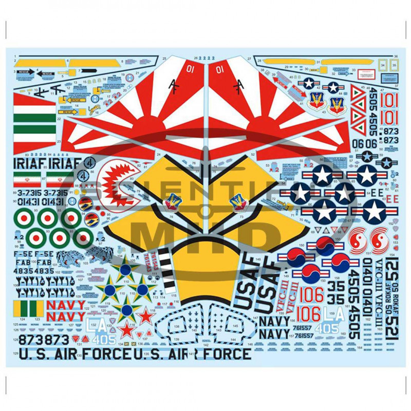 Les décorations incluses dans le kit de maquette sont celles de l'USAF "Agressors", US Navy, Mexique, Corée du Sud, Iran, Singapour et Brésil.
