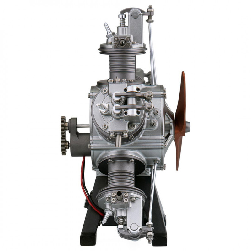 Comme un véritable moteur : un démarreur électrique entraîne le volant moteur, qui fait tourner le vilebrequin. Ce dernier transmet le mouvement aux bielles et aux pistons, tandis que les tiges de culbuteurs actionnent les soupapes avec une précision synchronisée. Même l’hélice tourne, entraînée par le vilebrequin – un moteur miniature en métal impressionnant de réalisme.