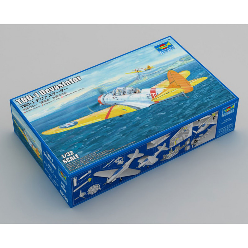 Cette maquette en plastique à monter du TBD-1 Devastator à l'échelle 1:32 de la marque Trumpeter contient 180 pièces à assembler.