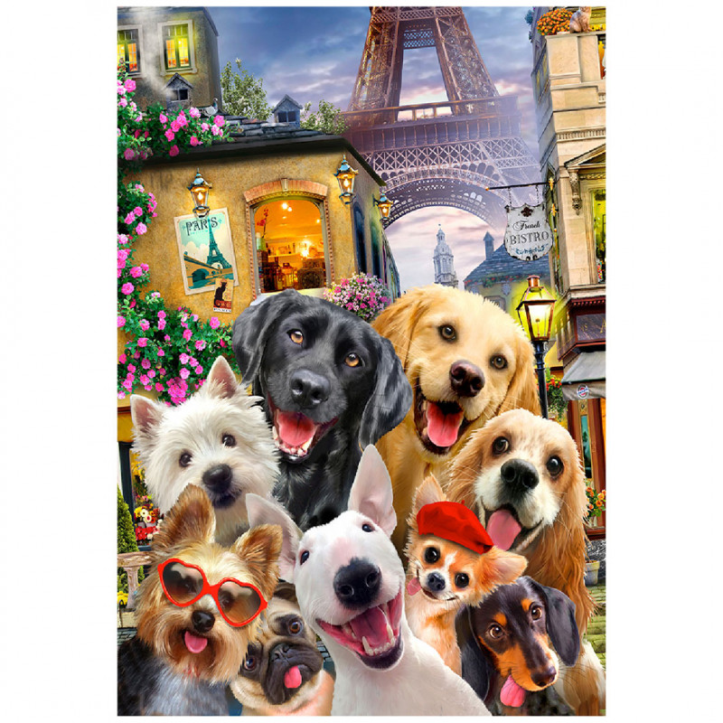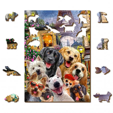 Ce puzzle 200 pièces met en scène d’adorables chiots posant pour un selfie devant la célèbre Tour Eiffel.