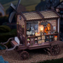 Une roulotte ancienne entièrement aménagée et équipée d'éclairages.
