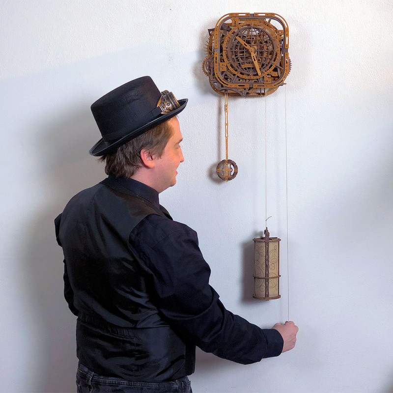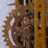 Une fois montée, cette horloge mécanique en bois devient une véritable œuvre d’art à suspendre.