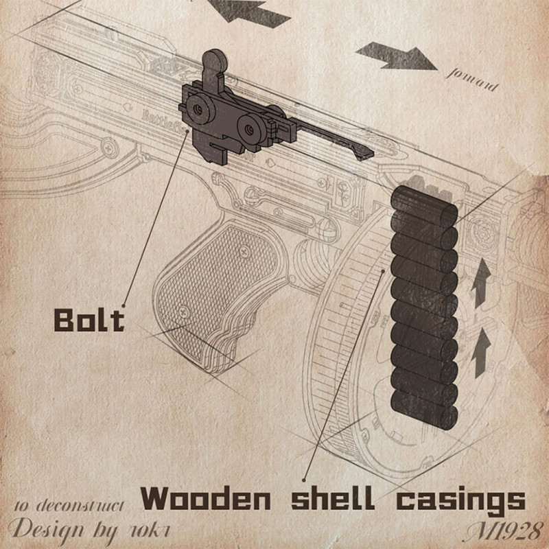 Assemblez cette magnifique réplique de mitrailleuse Tompson et tirez des élastiques en rafale ou en coup par coup, de fausses cartouches sont éjectées durant les tirs