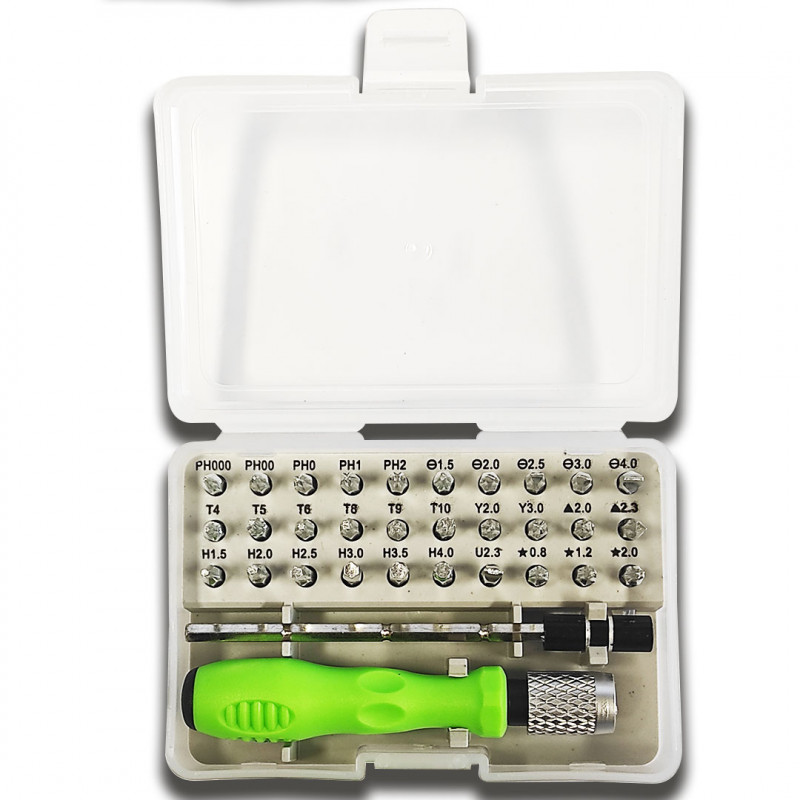 Set contenant un manche ergonomique, une rallonge et 30 embouts différents, dans un coffret plastique.