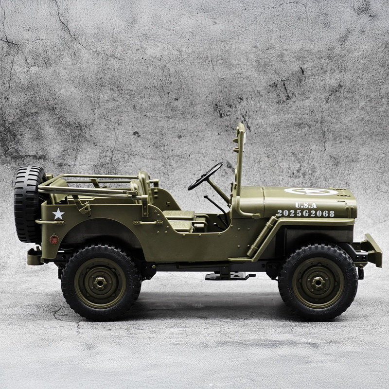 Découvrez cette Jeep radiocommandée traitée façon maquette, une fidèle réplique de la légendaire JEEP Willys.