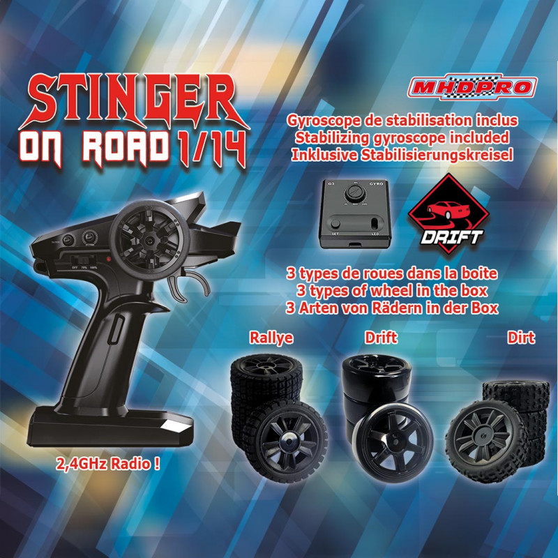 Contrairement aux voitures de Drift habituellement équipées de deux roues motrices et parfois sans gyroscope, la STINGER ON ROAD est conçue avec quatre roues motrices et équipée d'un gyroscope, facilitant ainsi le pilotage en Drift.