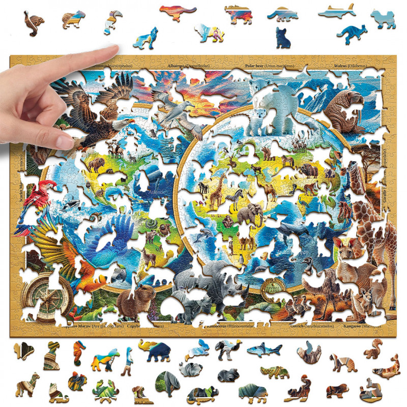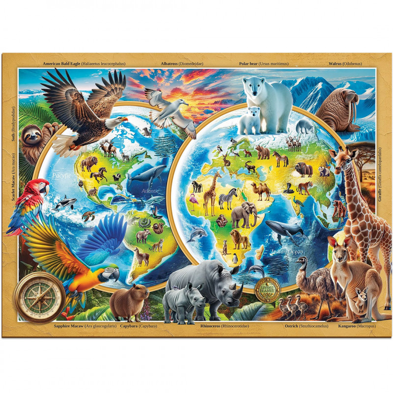Ce puzzle 1000 pièces déploie une carte du monde détaillée où figurent baleines, tigres, ours polaires, perroquets et bien d’autres espèces emblématiques.